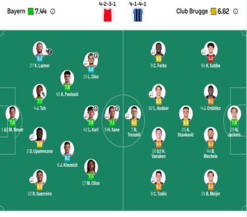 拜仁首发:1-诺伊尔、2-于帕梅卡诺(81’3-金玟哉)、4-塔、22-格雷罗(69’20-比朔夫)、6-基米希、27-莱默尔、45-帕夫洛维奇、14-迪亚斯(81’36-维斯多姆·麦克)、17-奥利塞、42-伦纳特·卡尔(69’8-格雷茨卡)、9-凯恩(69’11-杰克逊)。