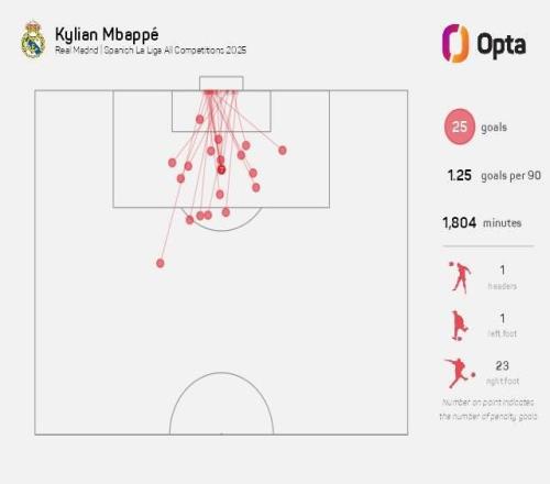 据统计,姆巴佩本赛季代表皇马在各项赛事已打入5粒禁区外进球,比五大联赛其他任何球员都要多。