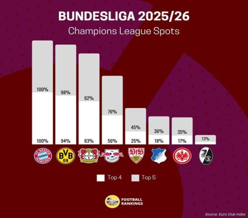 Football Rankings预测德甲本赛季前四名与前五名概率: