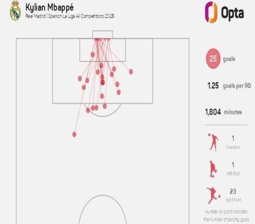 姆巴佩本赛季已打入5粒禁区外进球,为五大联赛球员最多 -